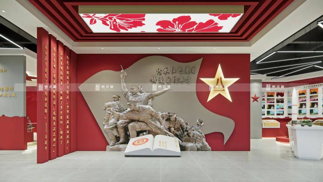 步入展厅序厅,迎风招展的立体旗阵与战士冲锋群雕构成动态视觉交响,让参观者在踏入展厅的瞬间便与国防脉搏同频共振。设计师摒弃传统展馆的单向灌输模式,采用”沉浸式叙事”理念:脚下的翻卷书页与左侧立柱镌刻的领袖金句化作精神灯塔,将国防教育与文化传承熔铸成具象符号。
