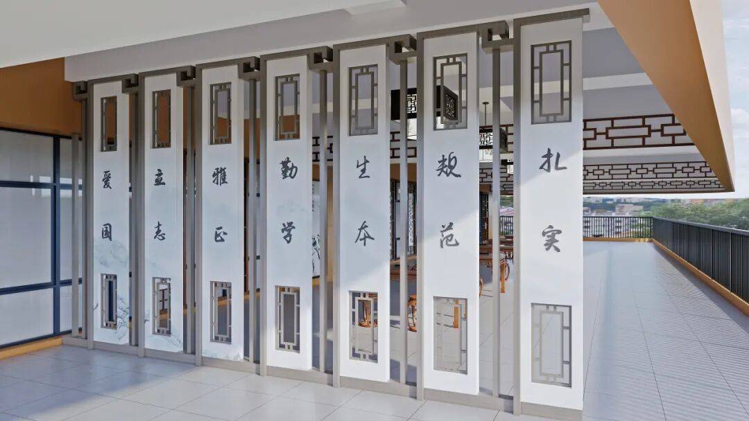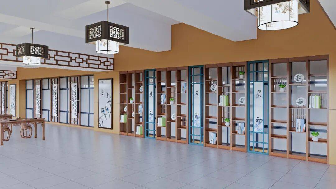 踏入这方空间,格栅的光影、吊灯的晕染、书法的侵染,共同编织出文化仪式感”。喧闹的课间自动降速,奔跑的脚步不自觉放轻,文化敬畏心在潜移默化中生根 。