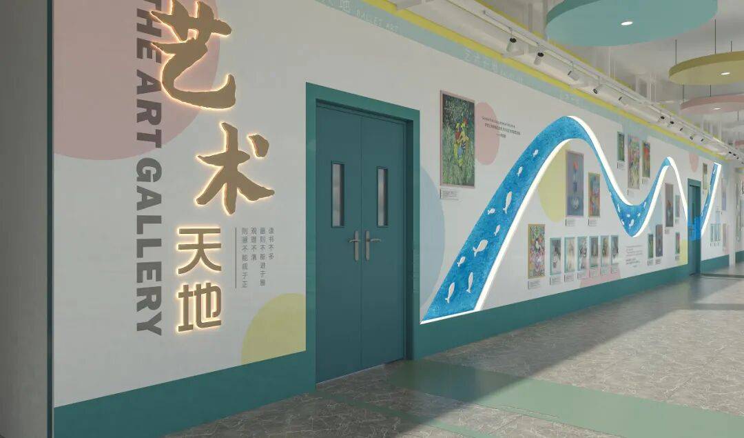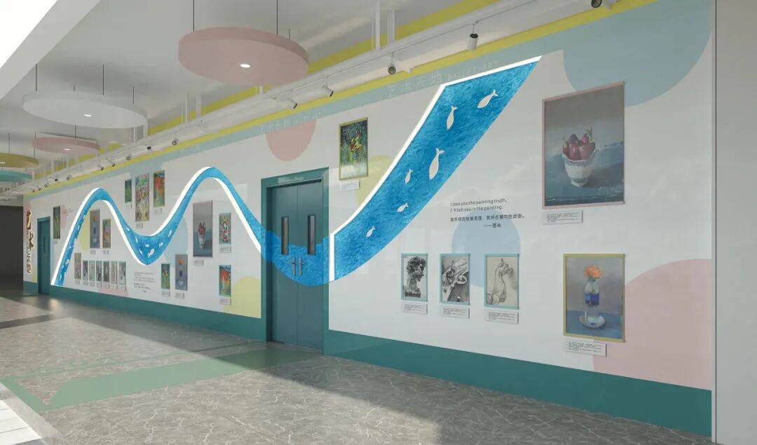 提取海洋意象,用蓝白渐变波浪形造型串联空间,内嵌学生作品展示槽;入口以“艺术天地”发光字点睛,淡粉、浅黄圆形色块柔化边界,营造艺术从墙面流淌出来的灵动氛围。