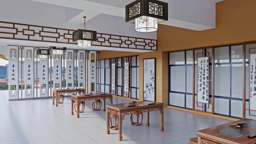 走廊尽头,仿古书画屏风围合半私密空间:水墨花鸟挂画旁,摆着明式雕花书桌与圆凳,砚台、宣纸、笔架成组陈列,还原文房雅趣;桌面预留书写区,既方便老师示范,也允许学生即兴创作。