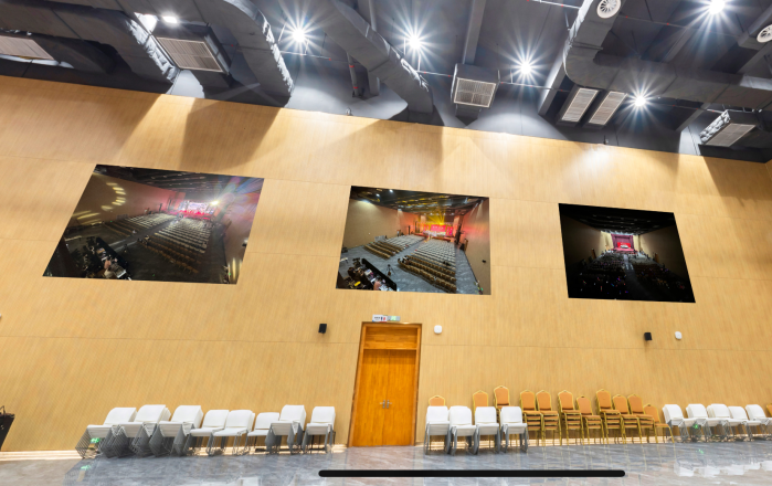③ 美学场景的“自然融合”:多功能厅以P1.5高分辨率大屏(120Hz刷新率)搭配90余台灯光设备,学术报告时呈现“像素级清晰”的课件细节,文艺演出时通过光影层次勾勒舞台空间感,让科技成为氛围的隐形画笔。