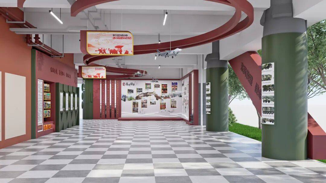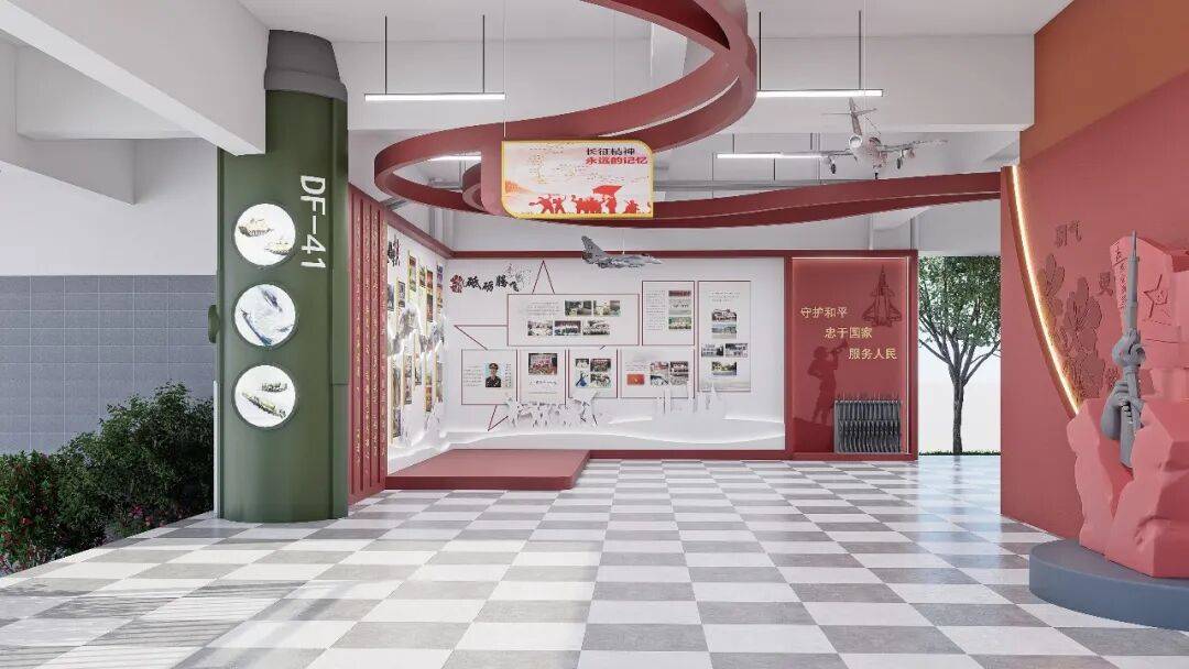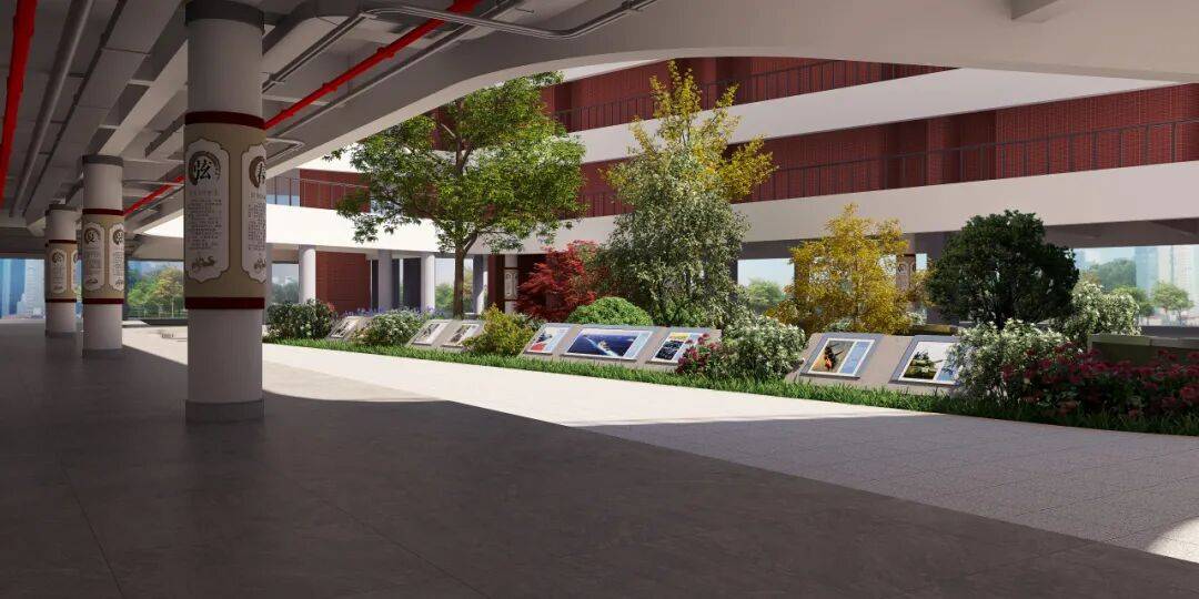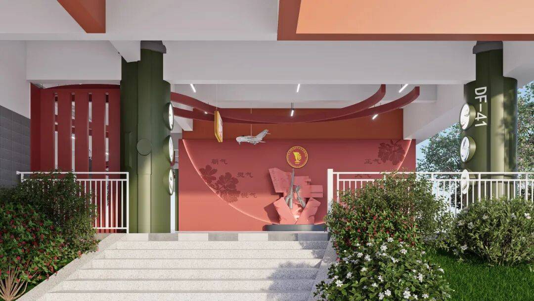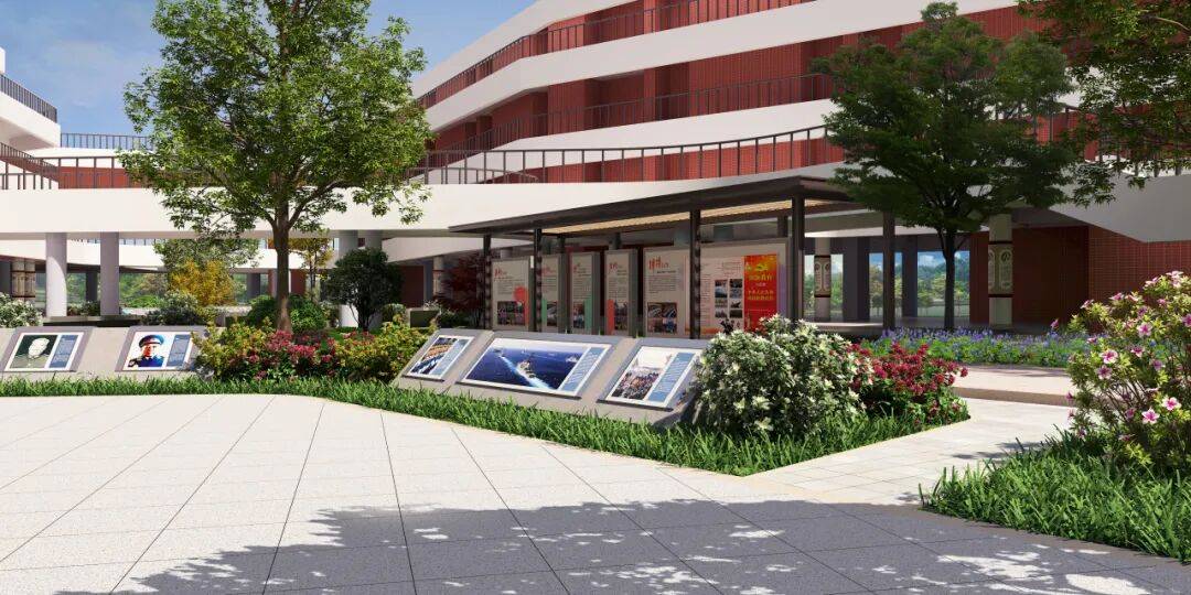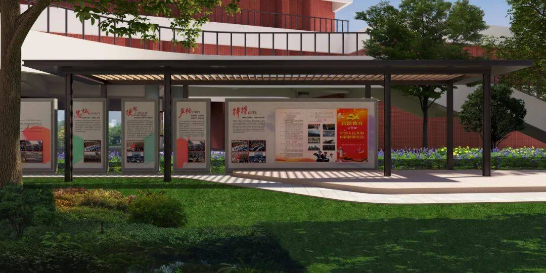 国防教育的关键,在于消弭距离感。在中庭院设计国防园,将红色精神从室内延伸到户外,融入师生的日常必经之路和休闲环境,意在塑造一个微缩国防世界,划分出开国元勋的伟大功绩展示区、国防军事装备展示区、国防教育法宣传栏等多个区域,让学生能在更开阔的空间中感知国防力量。在自然光的照耀下,在四季更替的绿植映衬中,历史故事的讲述变得更柔和、更富生命力。