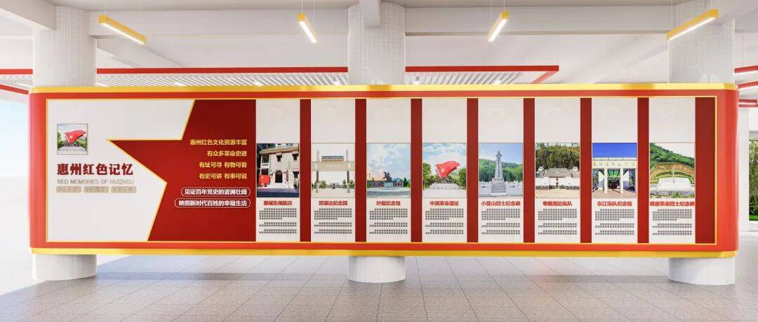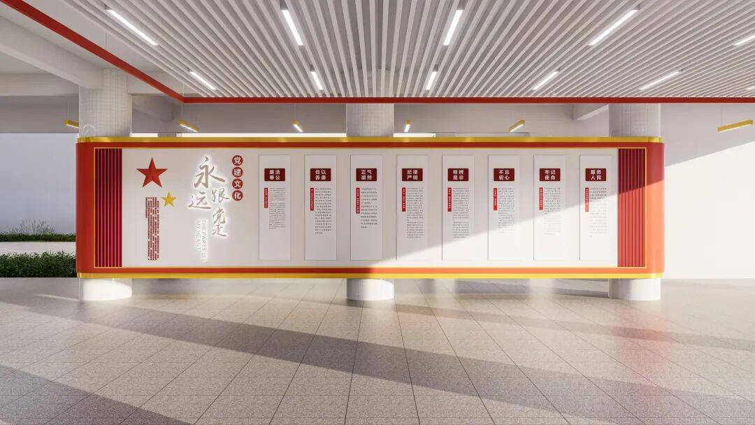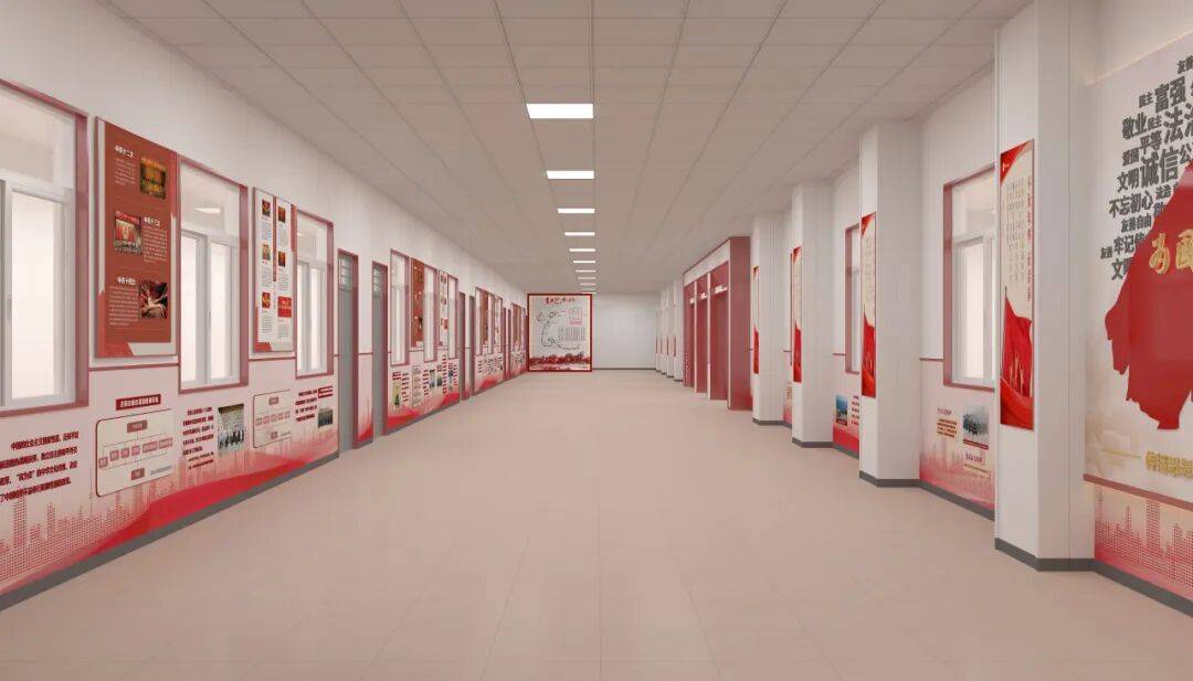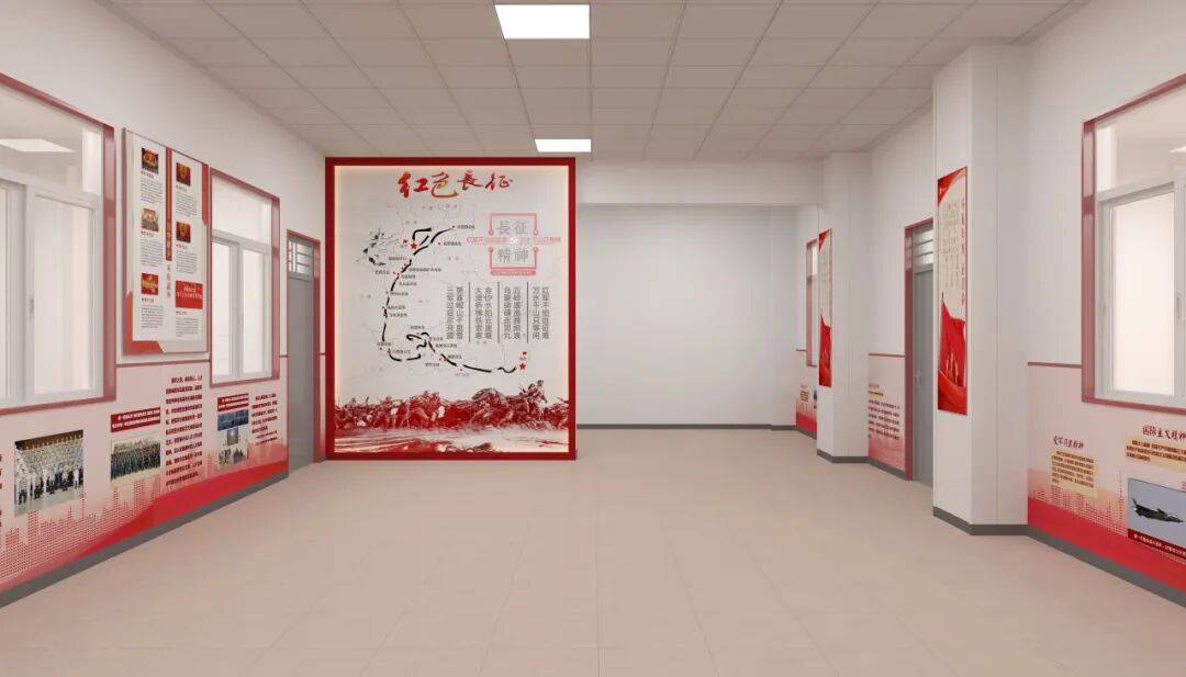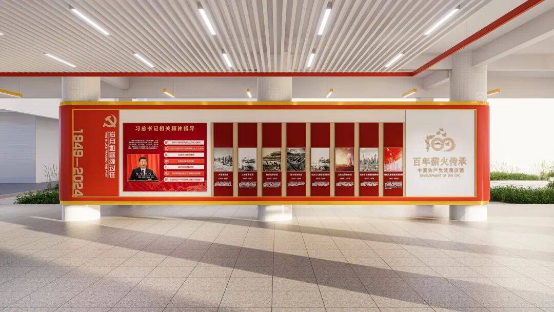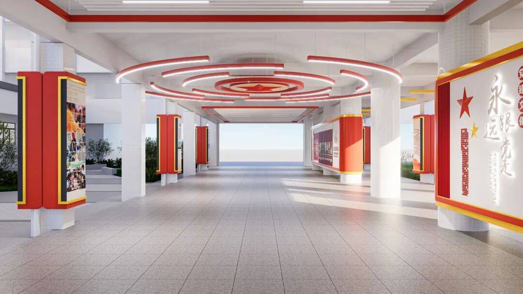架空层的先天优势,在于其公共性与流动性。它是课间的休息场所,也是师生往来教学区的中转带。策划时,我们以 “时间长河” 为核心逻辑,将党建长廊打造为线性历史叙事轴:从党的诞生星火,到新时代奋进征程,聚焦在抗日烽火里的英雄史诗,让党史化作文化长卷。利用架空层的柱体、墙面、顶面,织就点线面的立体叙事网,师生漫步其中,自然而然便完成了一场红色精神的洗礼。